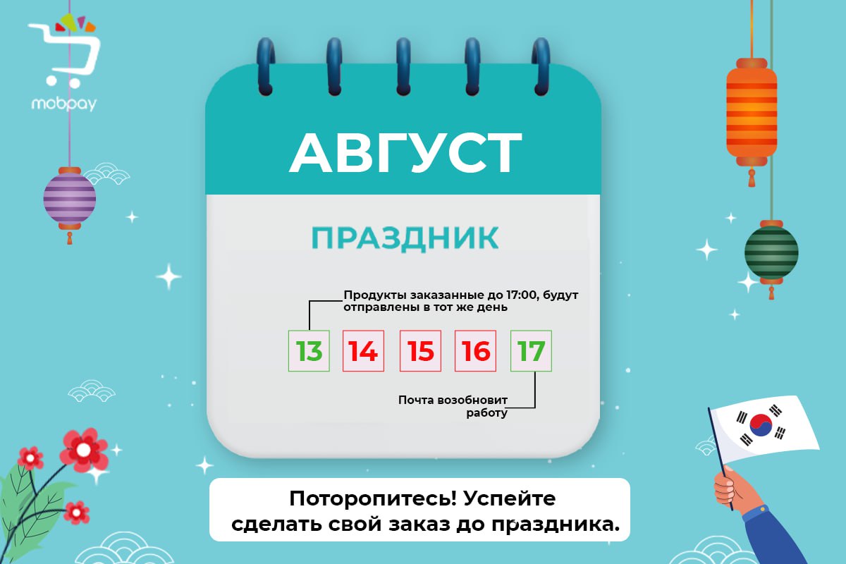 📌 В связи с предстоящим праздником в Корее график отправки заказов изменится: